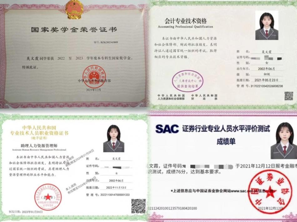 吴文霞,太阳成城集团tyc234cc20级经济与金融专业1班学生。2023年荣获国家奖学金,2021年、2022年荣获国家励志奖学金,获得全国证券模拟投资大赛三等奖、互联网+等奖项和荣誉数十余项。大学期间通过英语四六级考试,计算机二级,考取初级会计师、初级经济师以及证券从业资格证等证书。2024年,作为应届毕业生,成功上岸江汉大学商学院研究生。